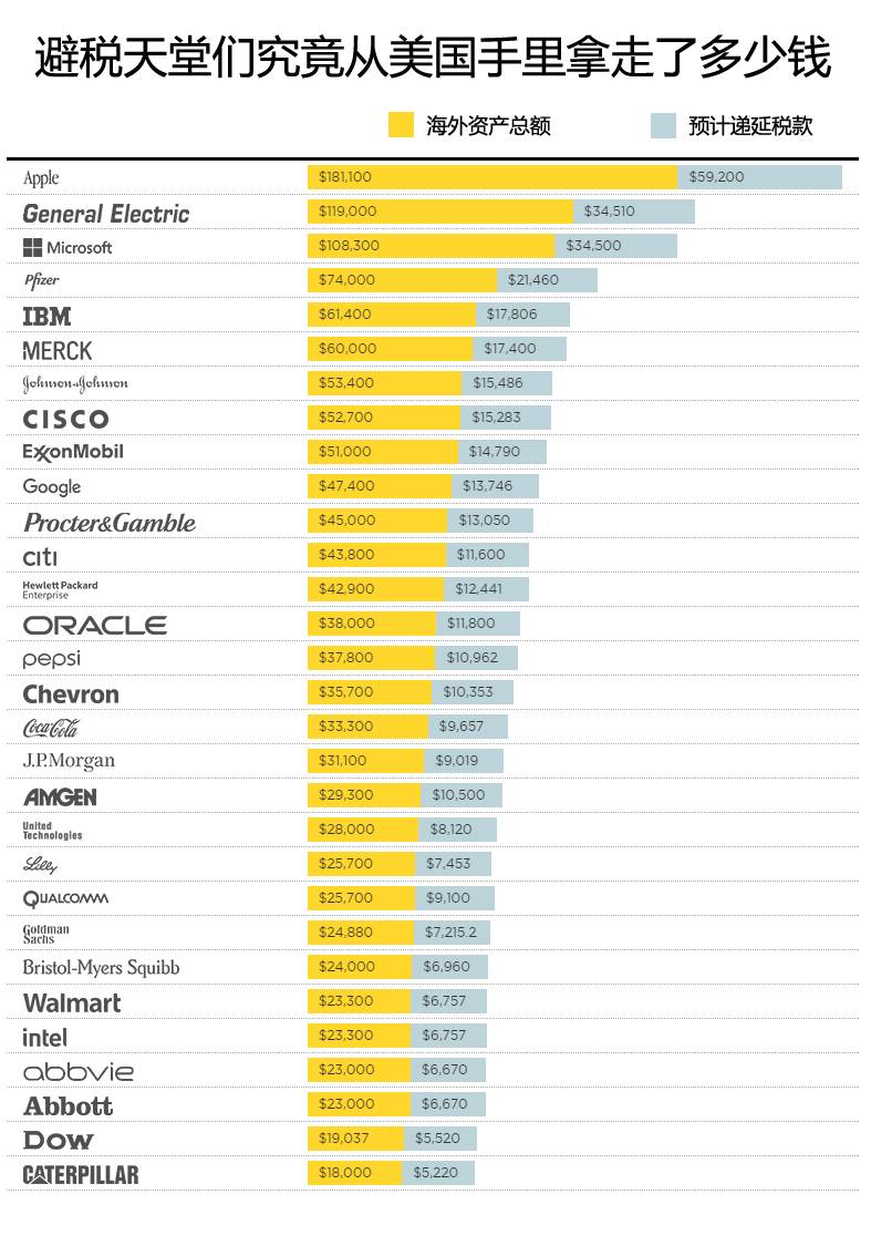 换句话说,如果这些公司上万亿美元的海外资产留在美国的话,美国国税局每年将会多出数千亿美元的税款,几乎相当于美国全年国防预算的一半。
