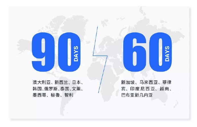90天: 澳大利亚、新西兰、俄罗斯、日本、韩国、泰国、文莱、墨西哥、秘鲁、智利